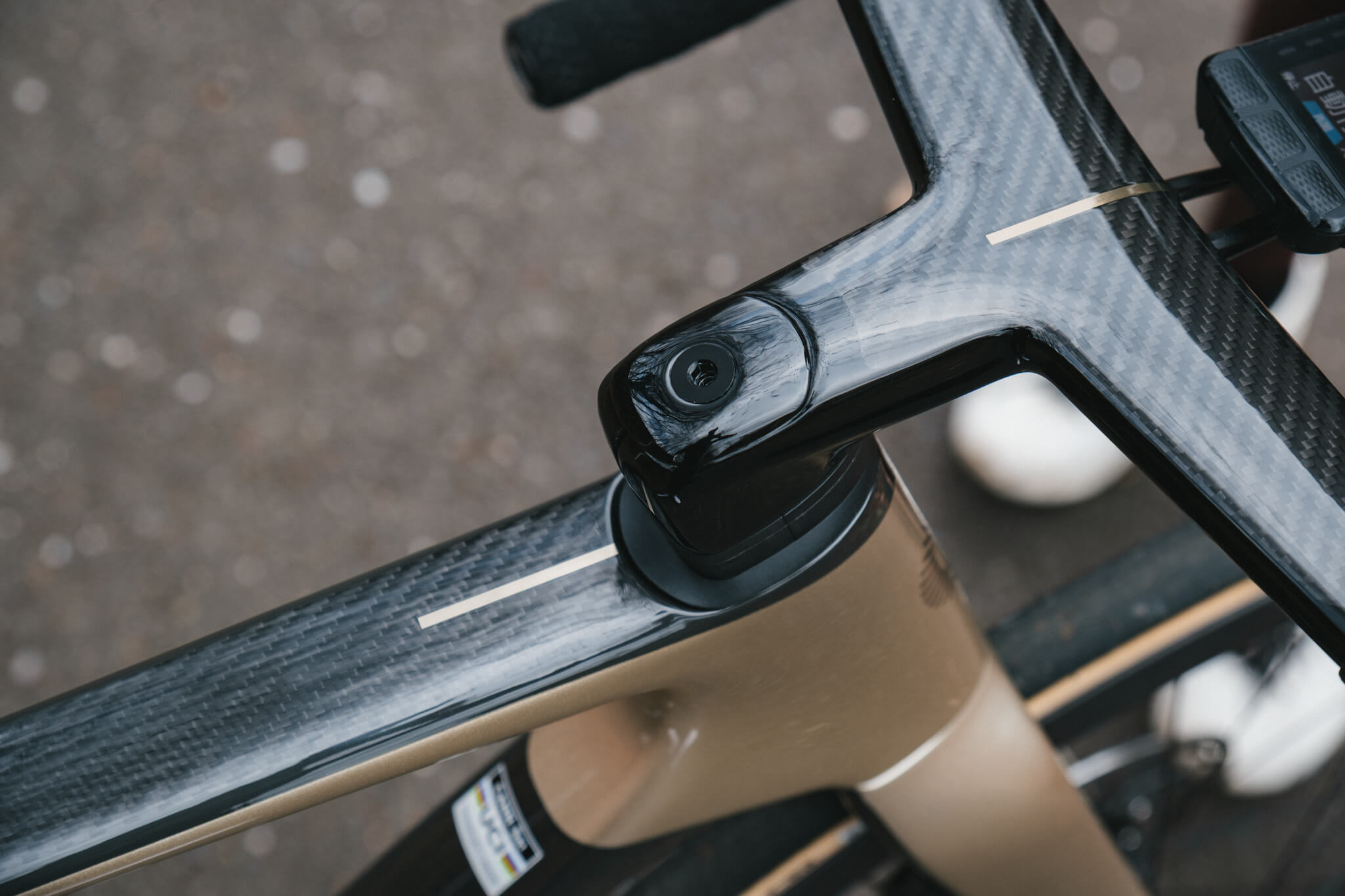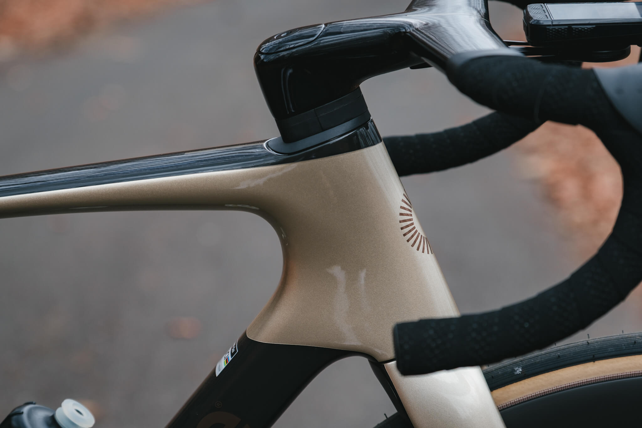 Hirokoの乗るテストバイクはフレームセット販売のみ(¥670,000)。落ち着いたゴールドの色味が綺麗で、「Gen 5を選ぶならこの色にしたい」と言う