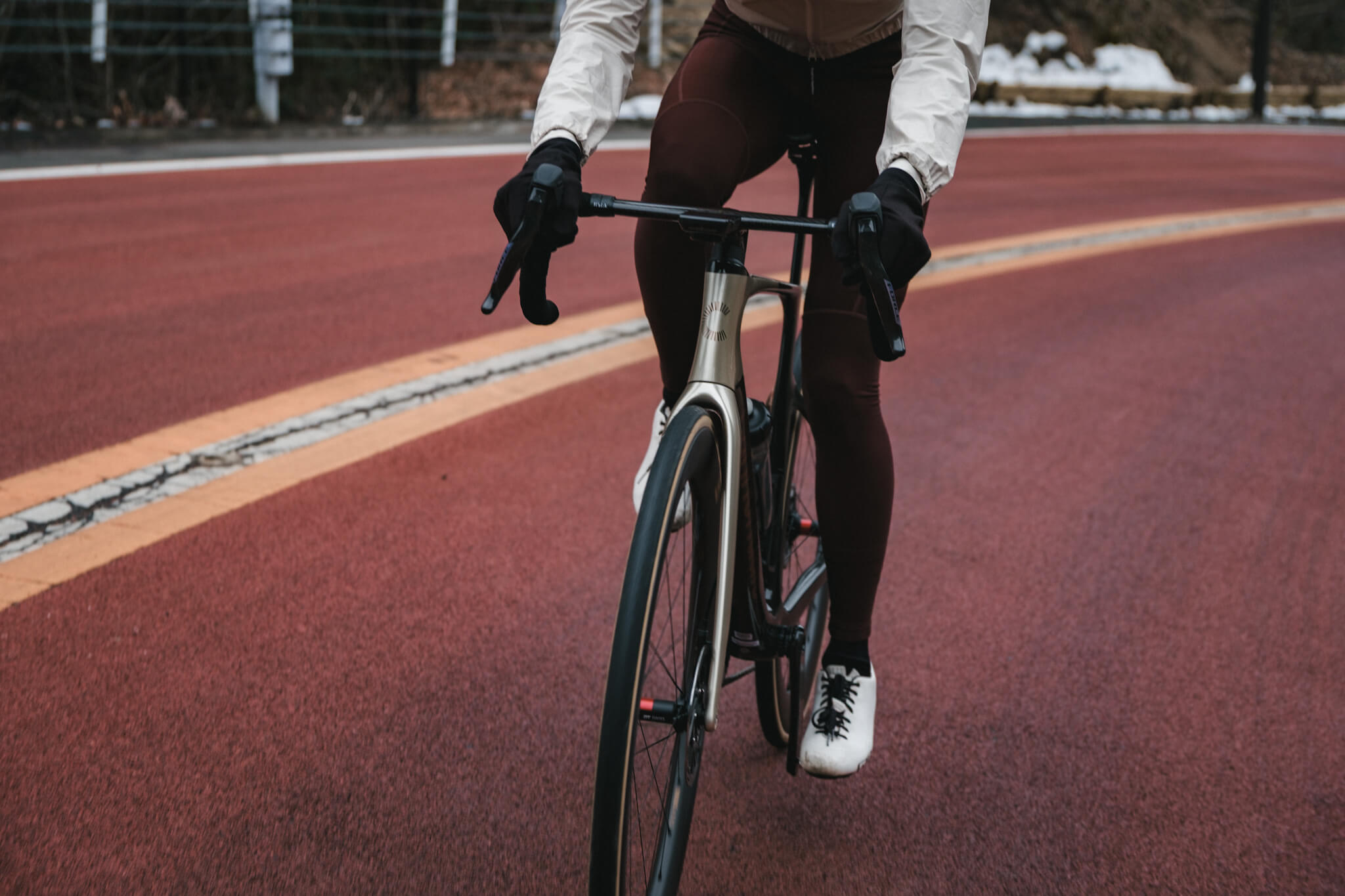 「EVO(Gen 4)に2年以上乗り続けて、走りの質の高さを実感しています。特に直進安定性が高くて、踏むと自転車自体が走ってくれようで、以前乗っていた自転車にはなかった感覚です。山もちゃんと走っていけるし、5%くらいの斜度なら淡々と回すだけで進んでくれる。色もブラックで格好良く、普段着ているPNSとも合う。Gen 5に乗るまでは、不満を感じることはなくて、これ以上何を新しくする必要があるんだろう?と感じていたのが本音です。」