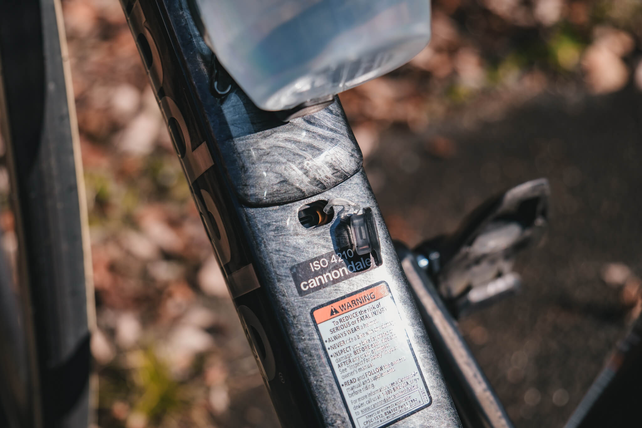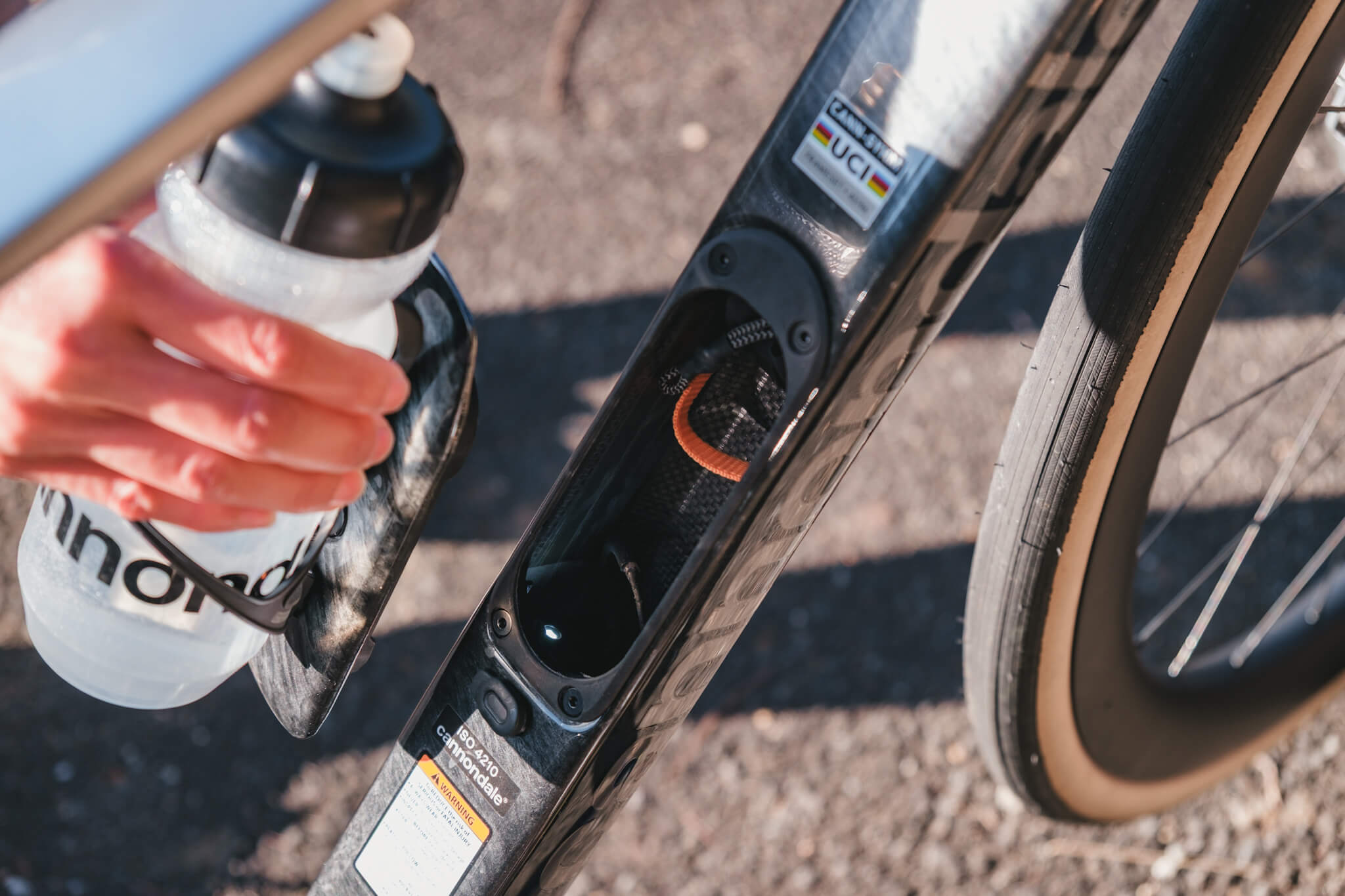 ダウンチューブには専用のケースが収納でき、パンク修理キットはすべて中に入れればOK。現実のライドのための合理的な設計だ