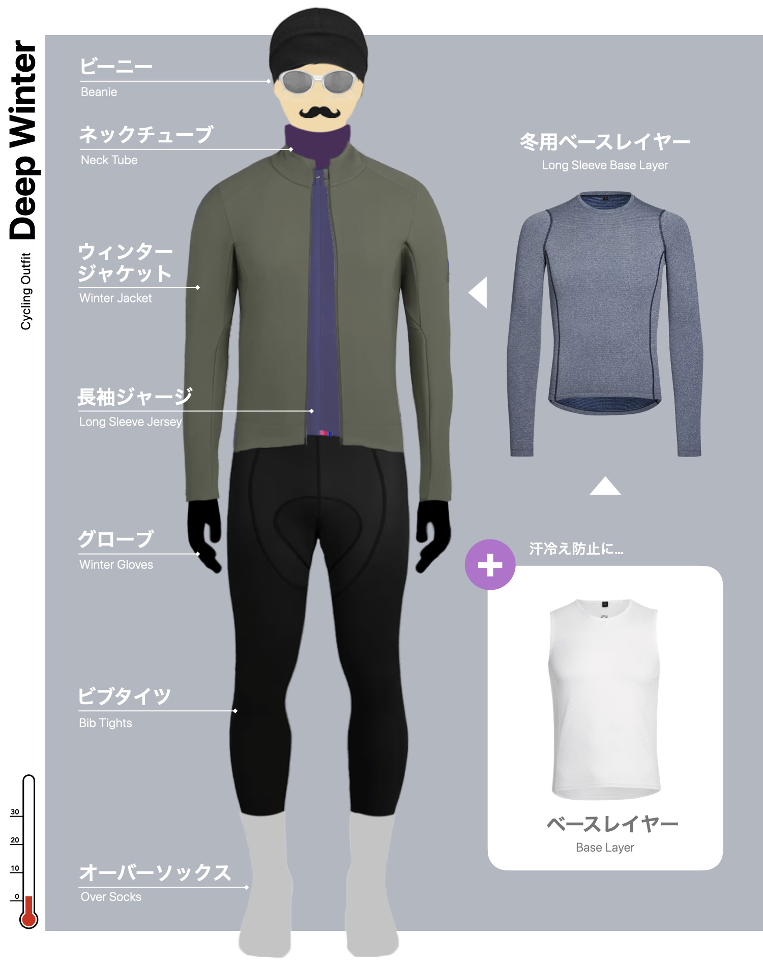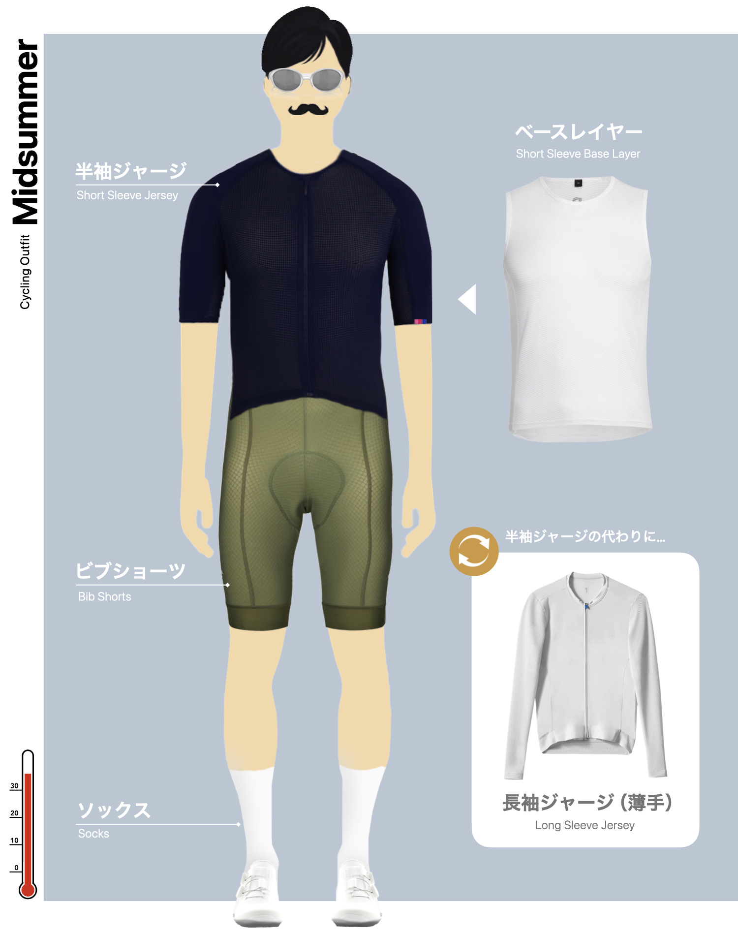 気温だけでなく、ライドの強度やスタイルによっても組み合わせは変化する。