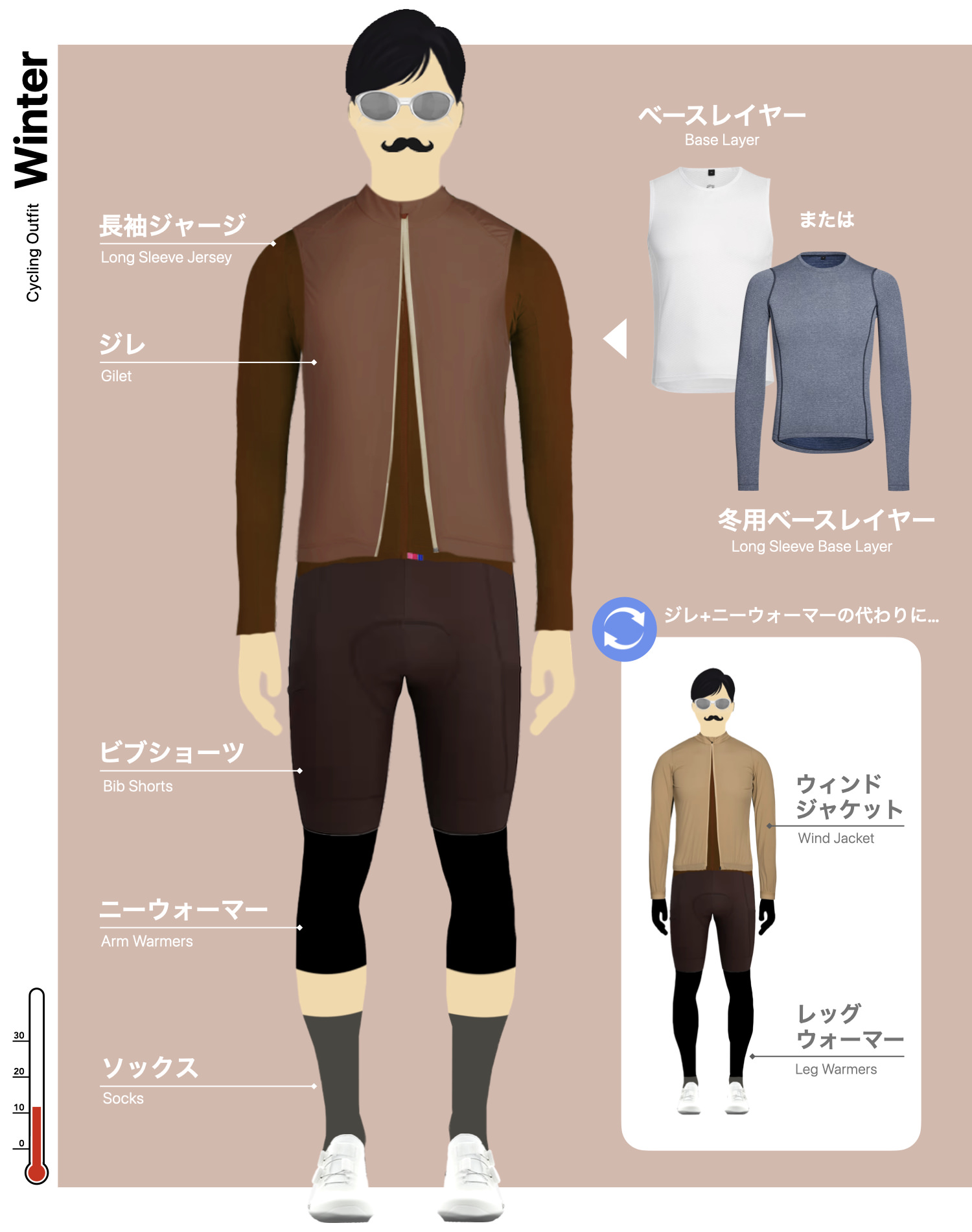 「ジレはいつ使う?」「薄手の長袖ジャージは要るのか?」「ニーウォーマーって何?」など、最初のころは適切な判断が難しいもの。