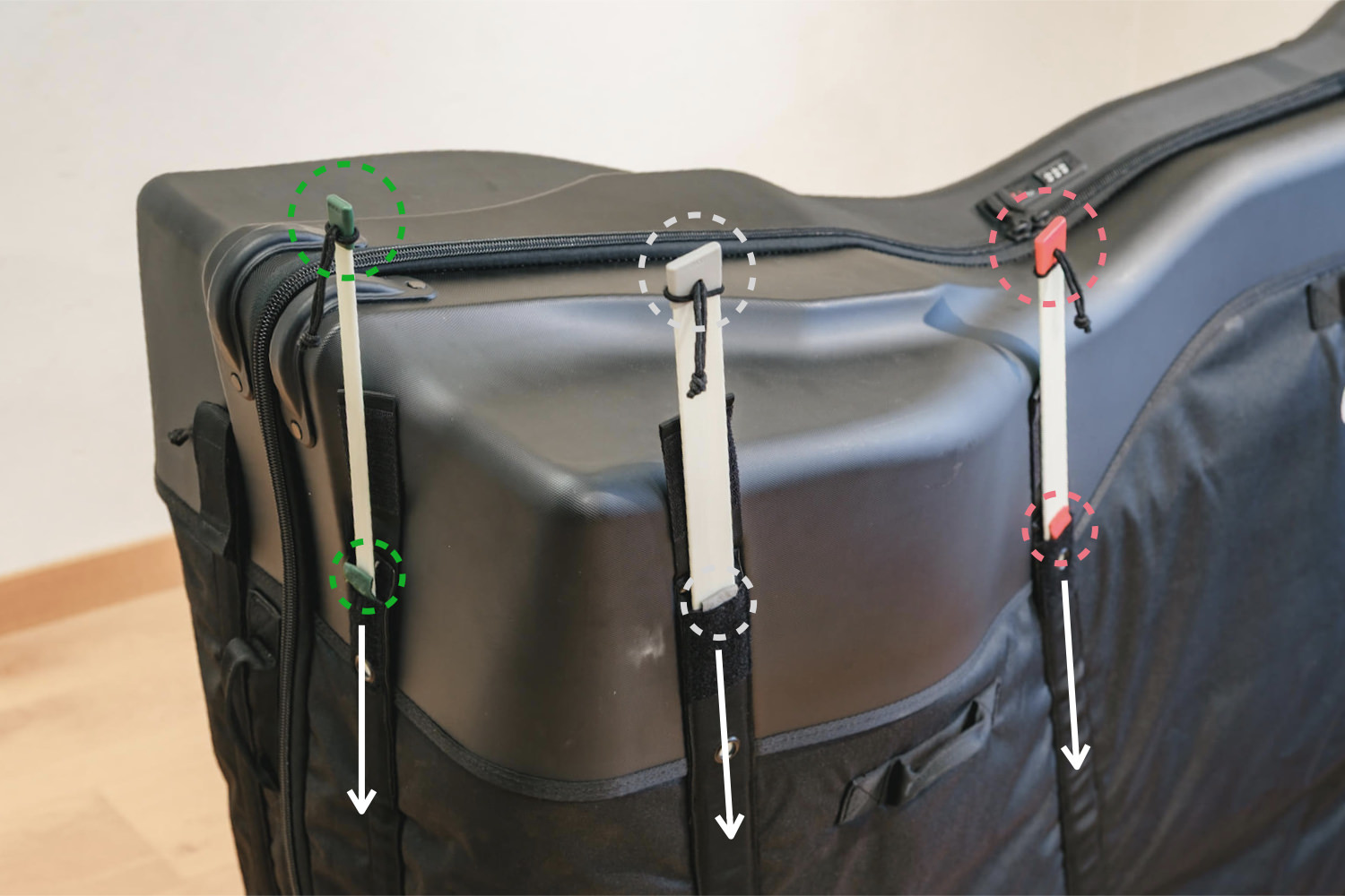 ホイール片輪だけ奥のスペースに入れて、付属のベルクロテープでホイールバッグの取手を固定する