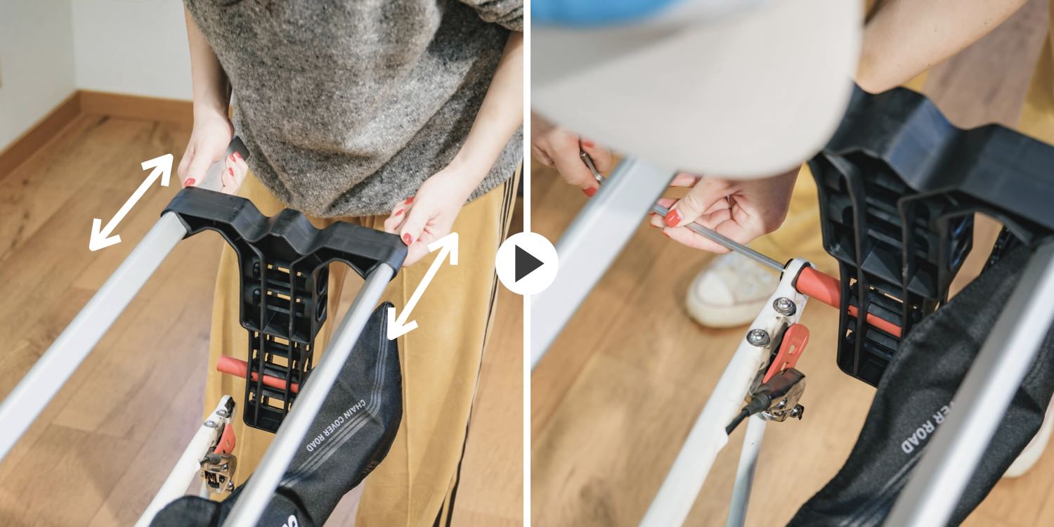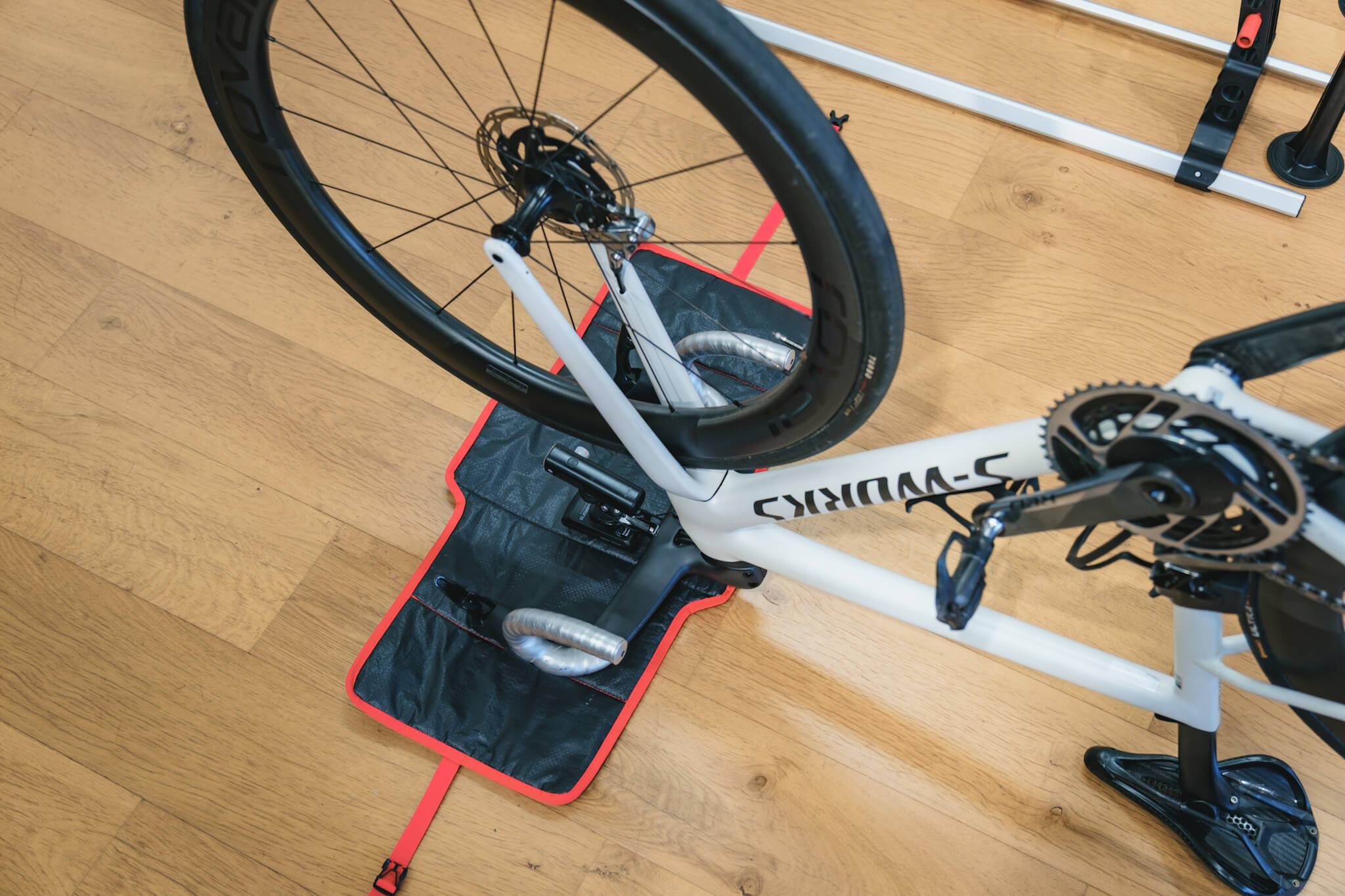 まずはギアをアウタートップに入れ、付属のコックピットパッドを敷いてフレームを逆さに置く。