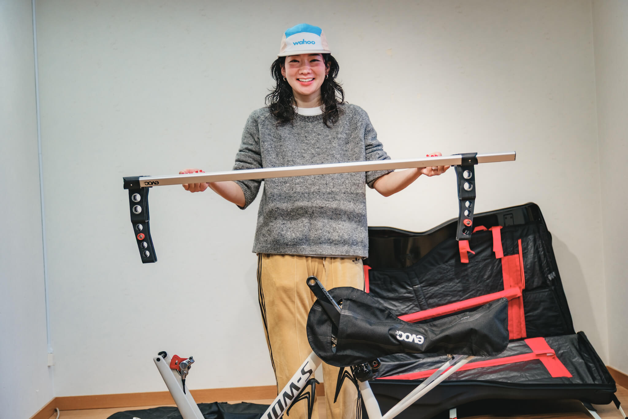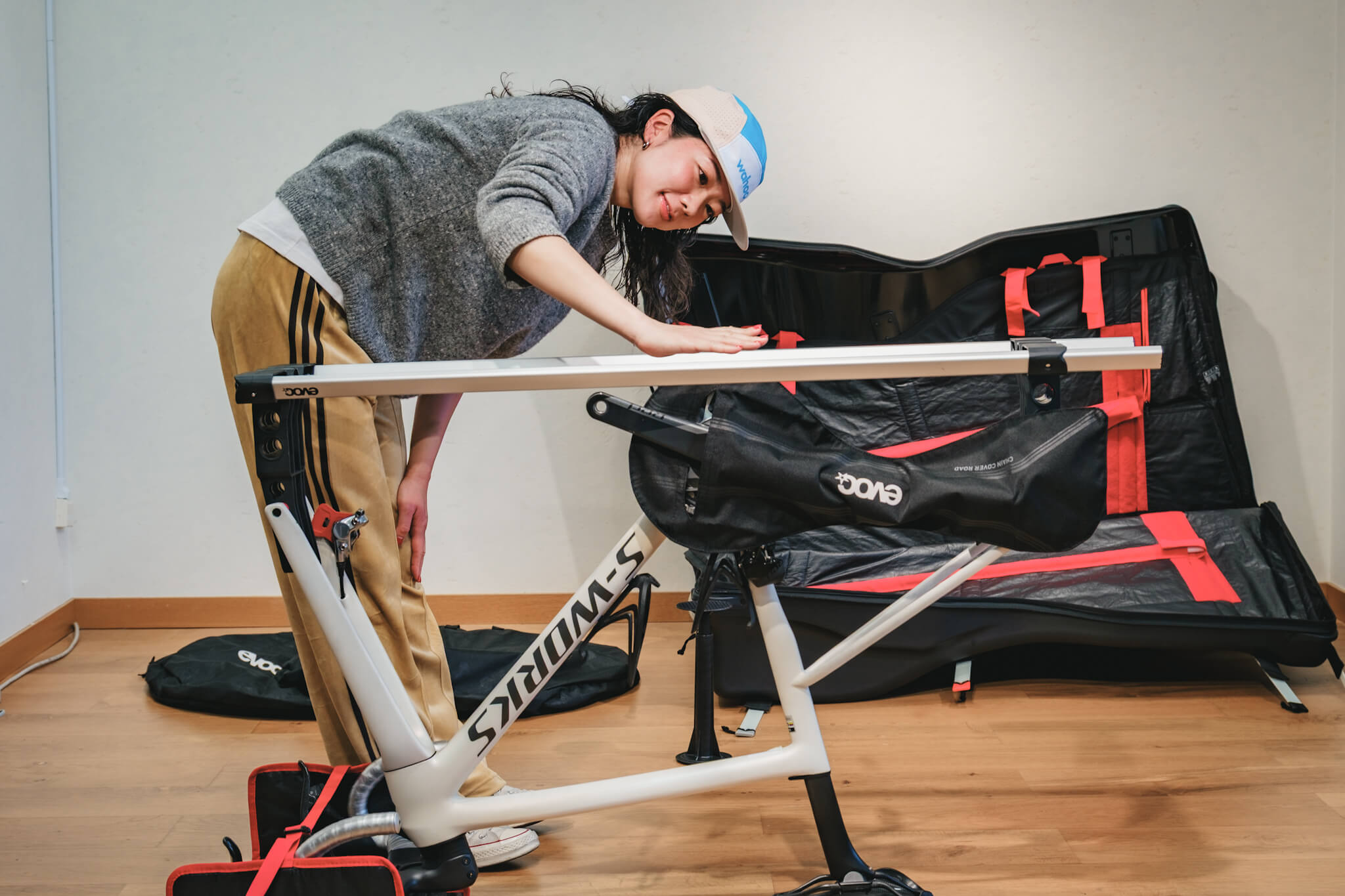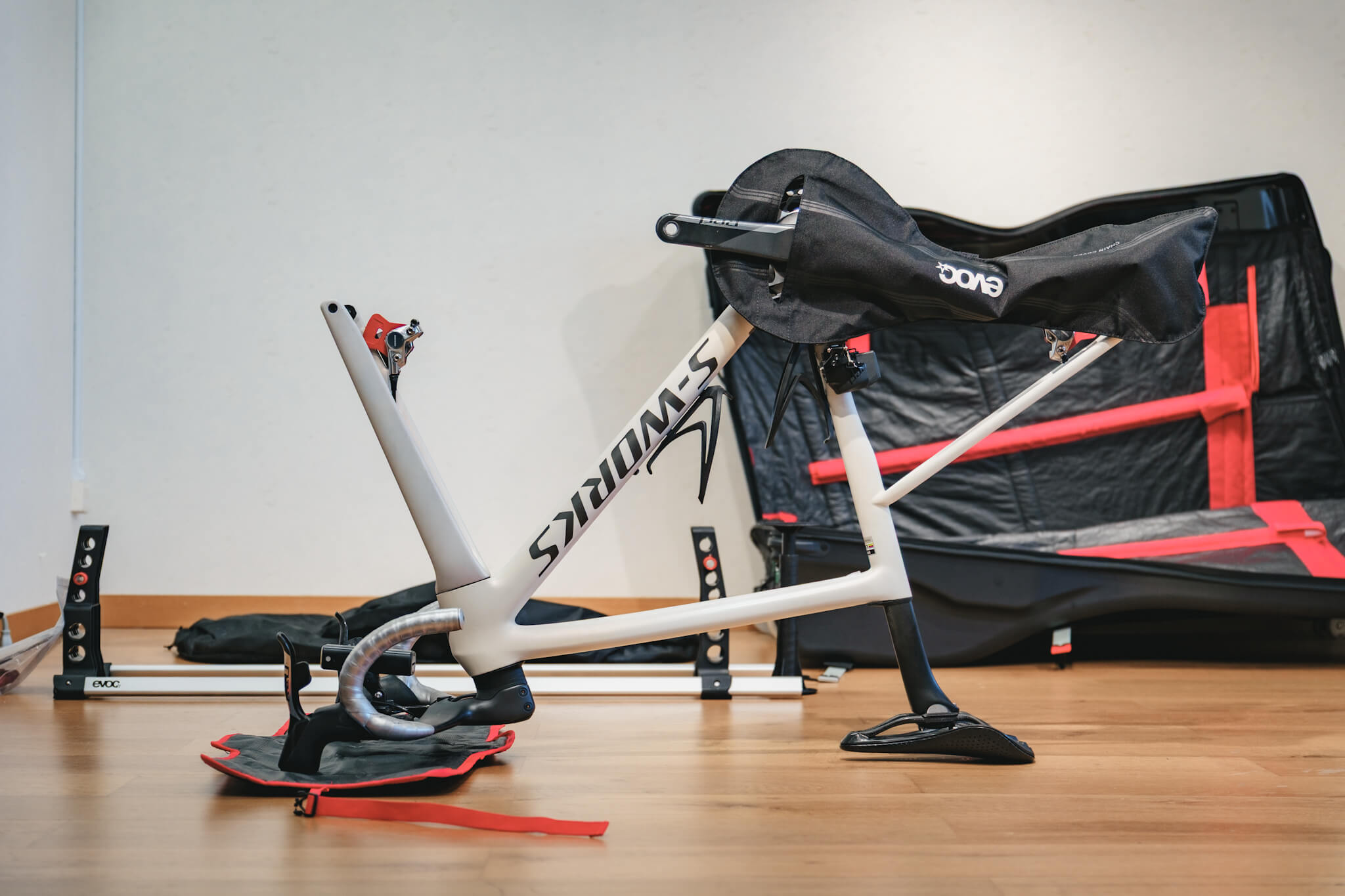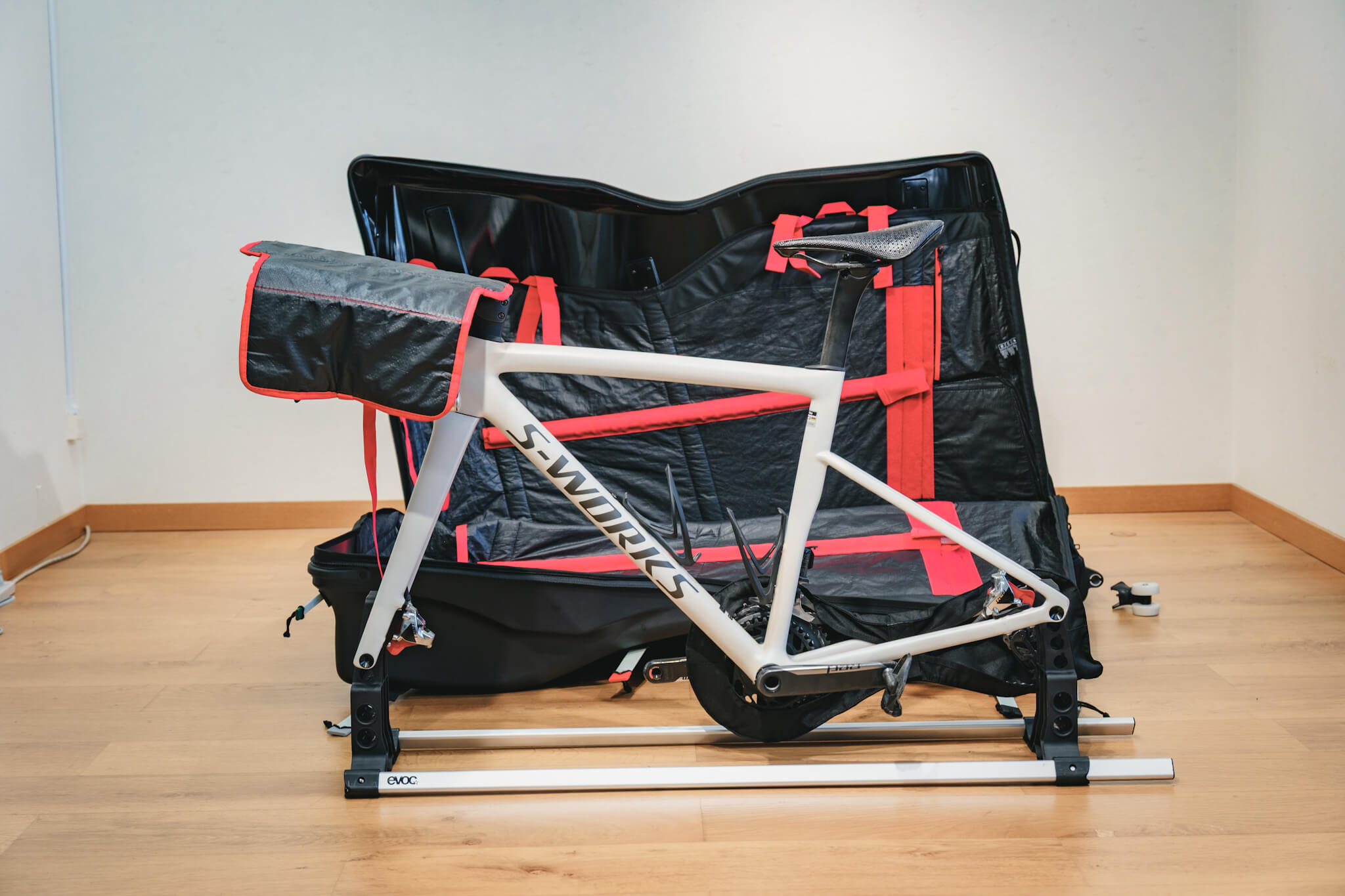 だから『evoc(イーボック)』を選ぶ。専用のスタンドでフレームを固定し、上下のハードシェルで挟み込む構造は、外部からの衝撃を物理的に遮断する。ハンドルバーを外さずに収納できるので、フル内装のバイクでもメカトラのリスクを最小限に抑えて、パッキング時間を短縮できる。