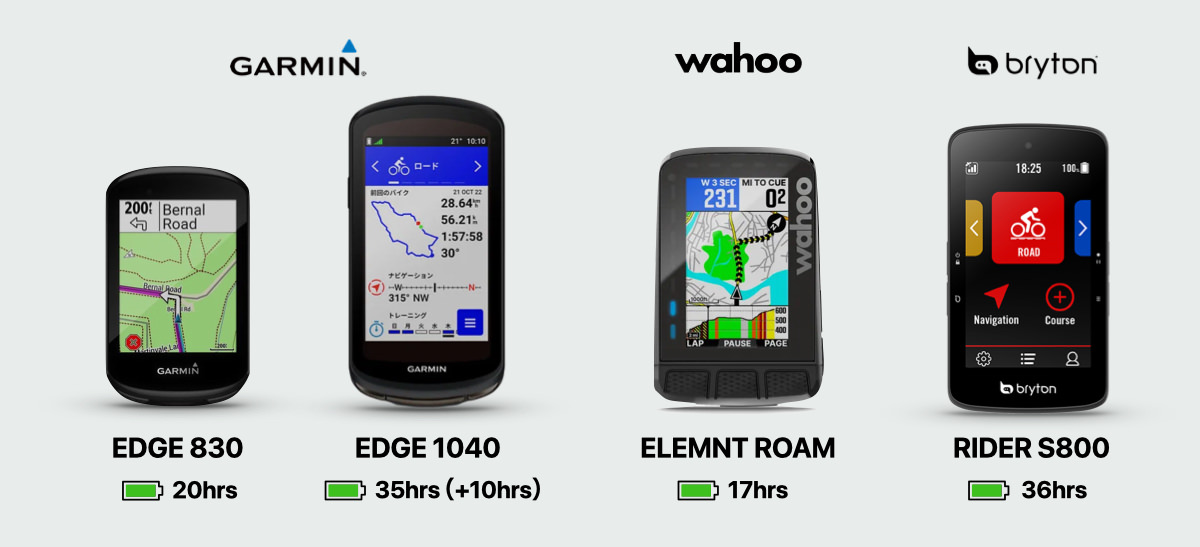 とにかくバッテリーライフを重視するのであれば「Edge840 Solar」、使い勝手を重視するなら「Edge850」「Edge1050」「ELEMNT ROAM」「ELEMNT ACE」という選び方となる。