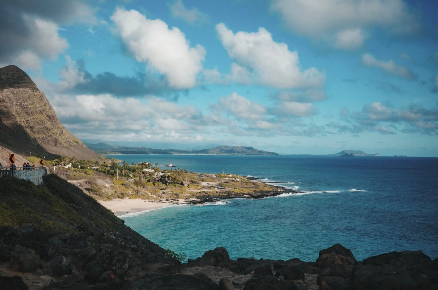 再び上り坂の先にあるマカプウ岬。海の向こう側にある陸地までコースは続いている…!