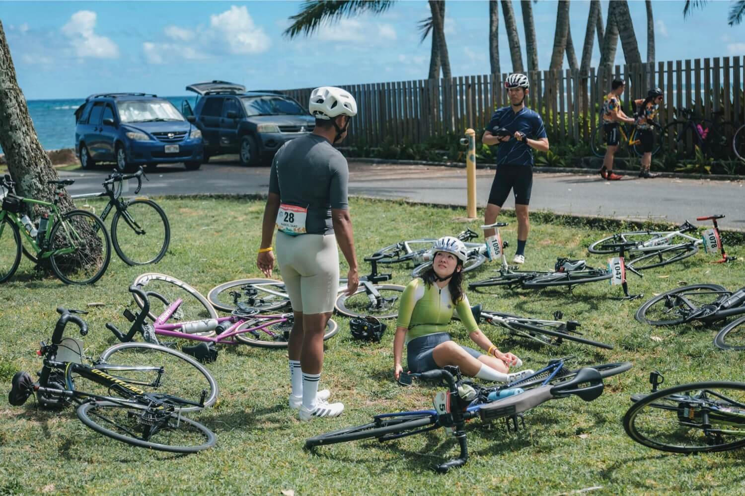 エイド内にいくつか設置されていたスプリンクラーが突然動き出して、停めていた参加者の自転車が次々と水浸しになっていったのがハワイらしかった。