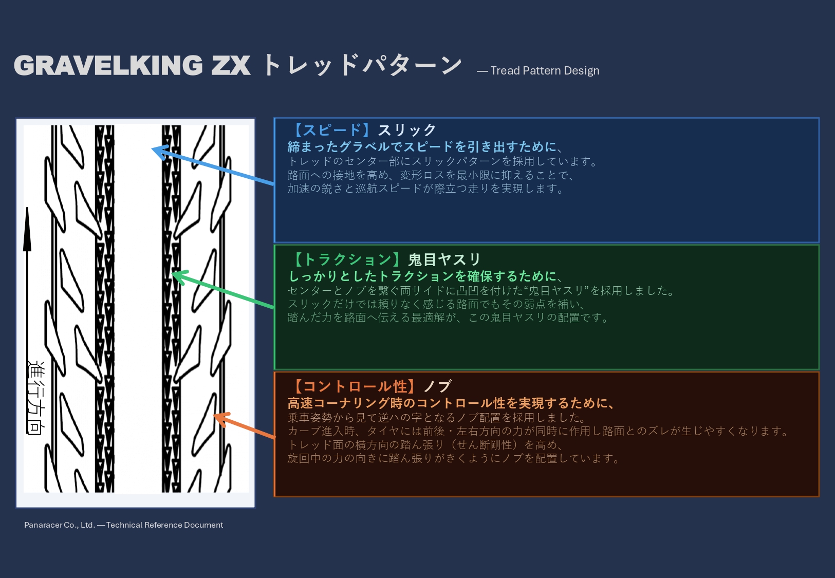 「GRAVELKING ZX」の最大の特徴は、世界各地のレースやイベントでのテストを経て生み出された独自のトレッドデザイン。